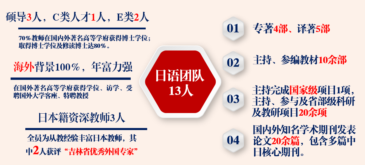 日语专业教师团队近年来,主持并完成国家社科基金项目1项。主持省部级以上教科研项目20余项,出版专著和译著5部,主持及参编教材10余部,在国内外重点学术期刊发表论文20余篇。