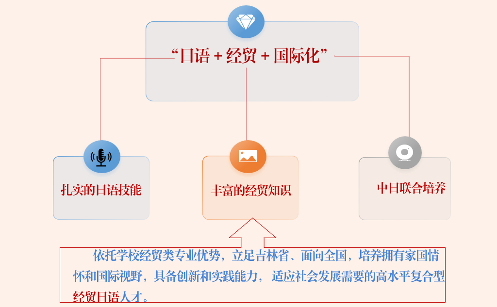 日语专业坚持吉林财经大学建设特色鲜明高水平财经大学的办学定位,立足吉林、辐射东三省、面向全国,着力培养会日语、懂经贸,拥有家国情怀和国际视野,具备创新和实践能力,能胜任教育、中外资企业或涉外机构工作的高水平的“日语+经贸+国际化”复合型经贸日语人才。