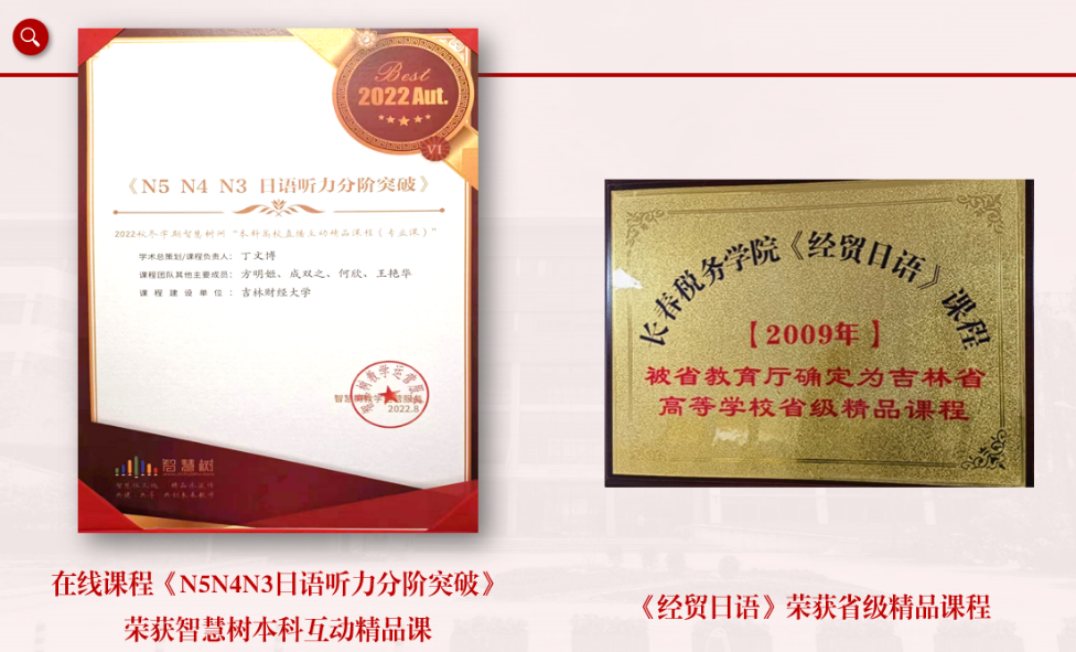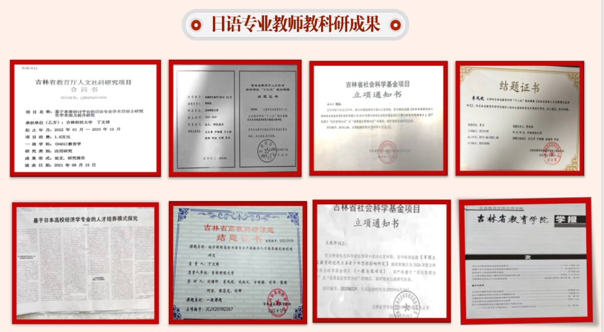 日语专业完成国家社科基金项目1项。在课程建设方面,专业主干课“经贸日语”被评为吉林省精品课,学科基础课“日语精读”被评为省级优秀课。“高级日语”被评为校级一流课程,在线课程“日语听力分阶突破”荣获智慧树本科互动精品课称号。2012年、2023年日语专业教学团队荣获校级优秀教学团队和优秀基层组织称号。