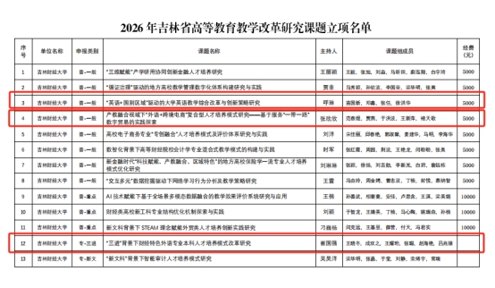 近日,吉林省教育厅公布了2026年吉林省高等教育教学改革研究课题立项名单。我院共有三项课题成功获批立项,分别是呼琳老师主持的《英语+国别区域”驱动的大学英语教学综合改革与创新策略研究》(省一般项目)、张欣欣老师主持的《产教融合视域下“外语+跨境电商”复合型人才培养模式研究——基于服务“一带一路” 数字贸易的实践探索》(省一般项目)、崔国强老师主持的《三进”背景下财经特色外语专业本科人才培养模式改革研究》(省专项教改项目)。此次立项总数占全校立项总数23%。