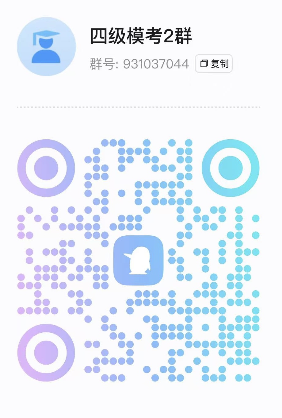 为帮助全校同学更好地熟悉大学英语四级考试的题型与流程,提前适应考试氛围,提升应试能力,我部将面向全校学生提供免费的大学英语四级考前模考服务。请有意向参加此次模考的同学扫码加入以下QQ群,报名截止时间12月2日下午16:00。