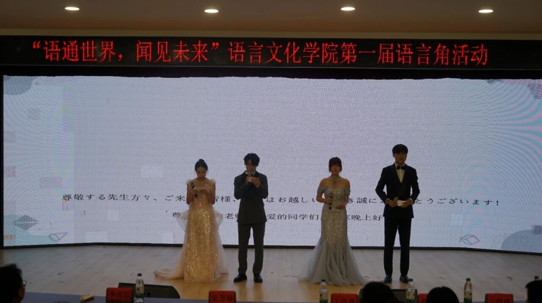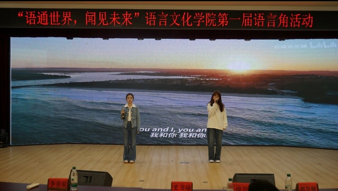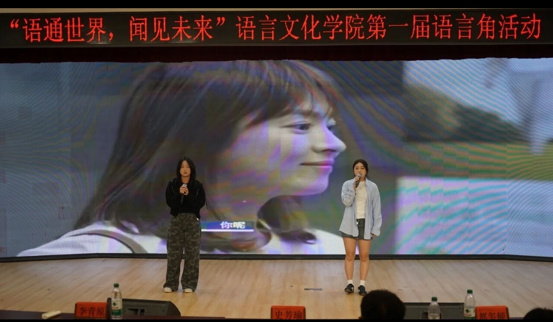 随后,语言与文化融合类节目轮番上演,展现了我院学子的语言应用能力与文化素养:英语配音《觉醒年代》以地道发音重现经典热血台词,让理想信念跨越语言壁垒直抵人心;日语配音《四重奏》精准捕捉角色情感起伏,从语音语调把控中彰显我院学子扎实的专业语言功底;韩语歌曲《Every time》旋律温柔婉转,演唱感染力十足,引人沉浸其中;英文合唱《Diamond》以双声交织共鸣,用清澈嗓音传递治愈力量;学习部编排的话剧《和平》则通过生动的情节演绎与角色塑造,在轻松氛围中带领新生感悟先辈精神,深刻诠释“语言承载文化、文化赋能语言”的内涵。