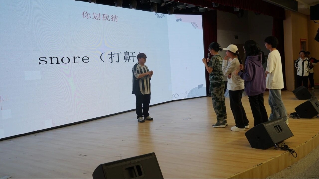 互动环节的设置进一步将现场气氛推向高潮。知识竞赛环节中同学们踊跃抢答,围绕语言知识、文化常识展开比拼,充分展现出扎实的知识储备;“你来比画我来猜”游戏则聚焦团队协作,通过肢体表达与语言理解的配合考验新生默契,现场笑声、掌声持续不断。两类互动环节既增强了活动的趣味性与参与度,更在轻松实践中帮助新生提升语言应用能力与团队协作意识,切实践行“学以致用”的语言教育理念。